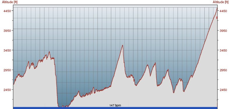 You know, I’m probably the last to figure this out, but there’s a double entendre in “Mountains of Misery.” On the one hand we might understand it as the mountains in which or of which there is misery. But what just hit me is that it’s really MOUNTAINS [as in a-whole-heaping-lot-of] misery. To the right is the elevation profile via my cyclocomputer.