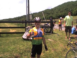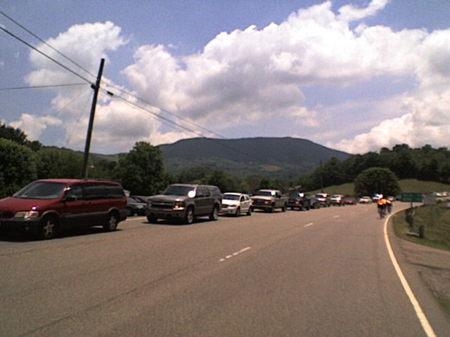 We stopped at Meat Camp to stretch out the legs in preparation for the climb through Potterstown and on up Snake Mt. I had forgotten. Granted, I was tired by then, but Wow. Having done previous rides certainly helped the leg strength, but a lot of riders were cramping or just didn’t have the leg strength to turn the peddle over. There were a lot of cheering supporters who encouraged us forward, and Peter and I made it to the top. Incidentally, it seemed that no one was in a hurry to descend. We recuperated a long time. The decent wasn’t as bad as I feared with the new chip and seal pavement. But the three cars we followed at 23 mph on the decent was a little a tedious. I wasn’t long that our escort moved on and Big Red motored past the group.