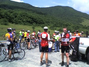 I returned to BSG after a year hiatus to ride with 2005 BSG comrade, Dr. Pete (seen here atop Snake Mountain). Peter, a good climber was off on Shull’s Mill as I laid back to conserve energy. We finally hooked back up at the rest stop on Railroad Grade Road. The ride up to that point was not exceptionally noteworthy. I got the usual comments, “Lookin’ good, Big Guy,” and the commiseration of other ‘big ‘uns,’ “These climbs are hard on guys like us….” I did, though have opportunity to put my particular gifts to use. The descent from the Parkway on Philip’s Gap Road was suited to me; I gobbled up and pulled along a half dozen riders all the way to beginning climb on Idlewild Road. While climbing Idlewild, a rider in a Bicycle Inn Jersey commented that I was, “powerful.” How much more gracious than the, “You’re a strong rider…for a big guy.”