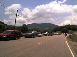 which was holding “Trade Days” a throw back to the early 18th Century wilderness Rendezvous. Rendezvous were a set time when trappers and traders in the back country of colonial America would gather to trade wears and well, party — a lot. You can see by the traffic that Trade Days is still quite a draw. (You can see the west side of Snake Mountain in the distance).