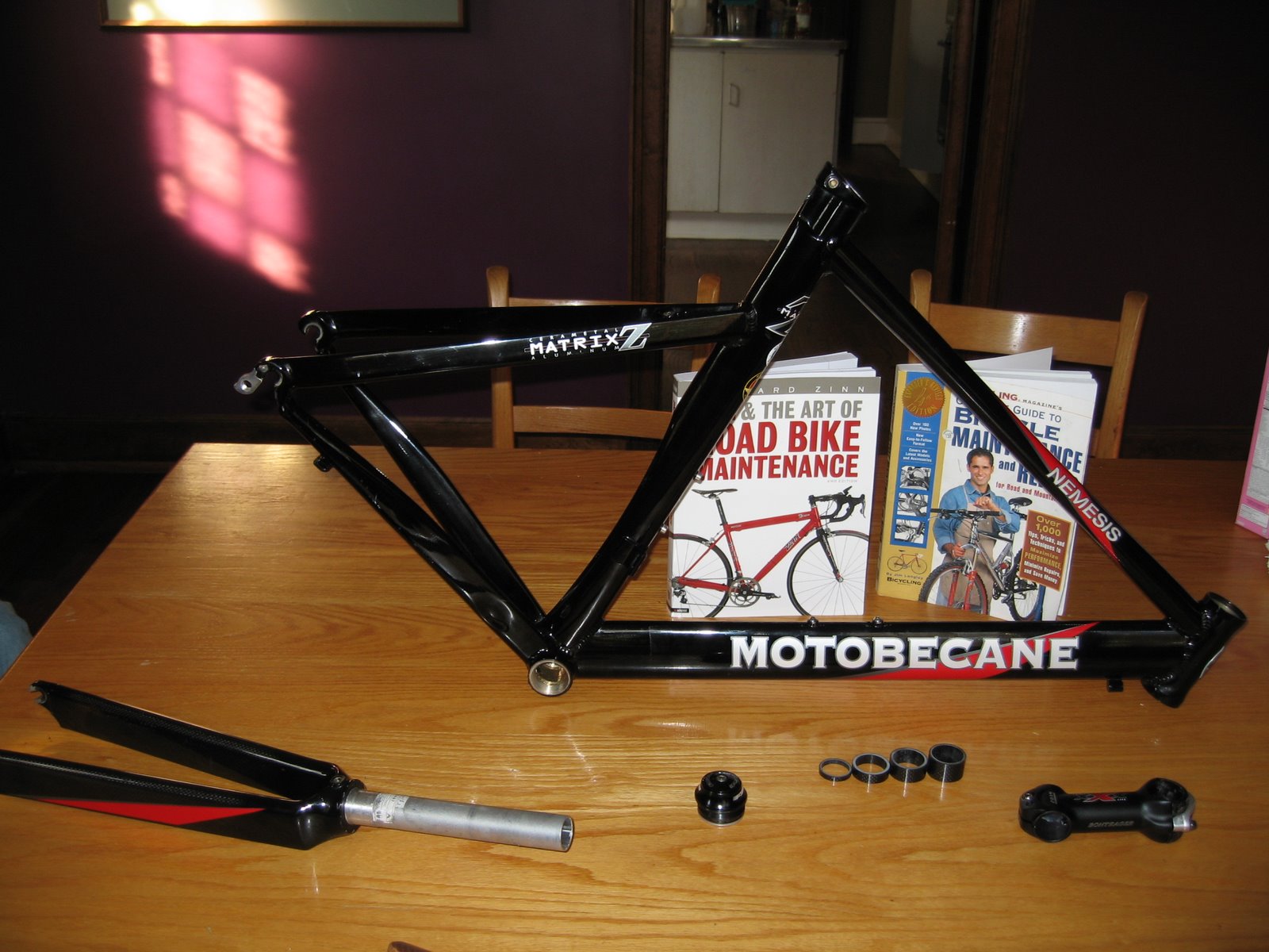 The project began by making several purchases off eBay. The first was a 2004 Motobecane Nemesis frame/fork and a few other odd parts. I have purchased pedals, base bar, and derailleurs. I already had wheels, bottom bracket, stem, and a crankset. Perhaps the most daunting purchase was the headset. There seem to be a bewildering amount of types/sizes. After quite a bit of research I came to the conclusion that I needed a Campy compatible integrated headset and settled on the FSA Orbit CE. I also purchased a Park PCS-1 repair stand that is en route.