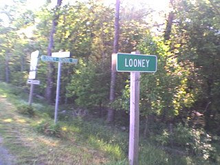 Red road with group out to the descent into New Castle, and in particular he road with D.C. cyclist/commuter Denise who said she remembered riding with him last year. (Red does not cut the kind of figure on velo that many forget.) Always grateful for company and conversation, Red was happy to pull on the downhills and be waited for on the climbs. Red told Denise about a peculiarly funny photo-op before the descent into New Castle — the community of Looney. The road sign behind reads, “Looney School Rd.” Who goes to the Looney School? The cyclists on the 11th Mountains of Misery were definitely on the road to Looney — and they were getting ready to be schooled.