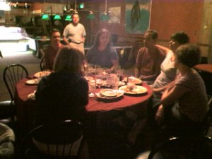 So, we ate dinner at a downtown Blacksburg Italian Family restaurant, Ceritano’s — “a bottle red, a bottle a white….” Ceritano’s serves delicious, authentic, slow food. They made accommodation for our large group and gave us plenty of time to linger and talk — the Italian way. Which is to say, Americans are much more demanding regarding quick service. Real, slow food is not a timed event, people. Speaking of “people,” we were all charmed by the family-Chum’s children, “People, I need a straw, can somebody get me a straw? People?” After dinner it was off to S-bucks for a desert coffee. Red ordered a skinny carmel mochiato. Red didn’t order decaf π¦ but fortunately, Red remembered π but he didn’t drink his desert :-(.