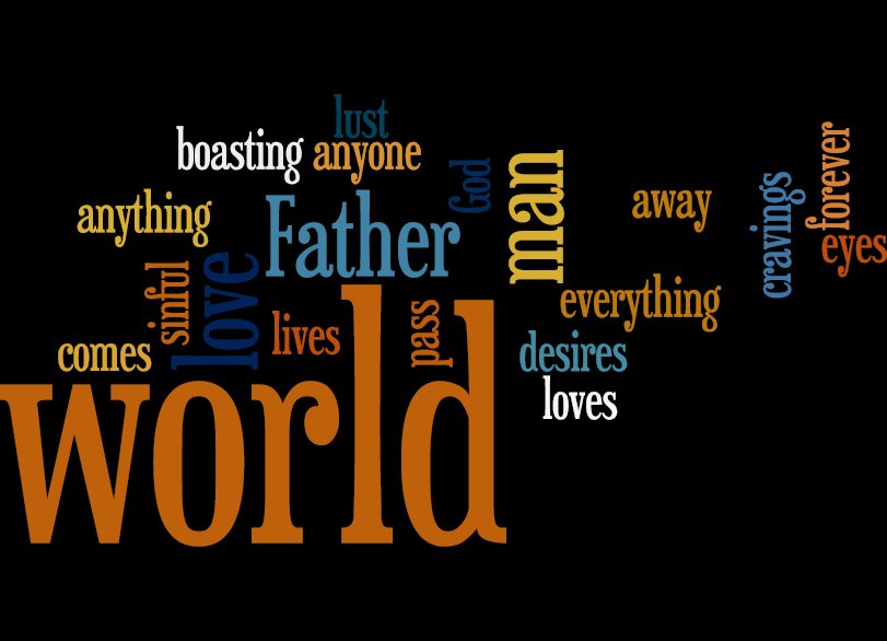 The wordle here is from 1 John 2:15-17 which reads: “Do not love the world or anything in the world. If anyone loves the world, the love of the Father is not in him. For everything in the world– the cravings of sinful man, the lust of his eyes and the boasting of what he has and does– comes not from the Father but from the world. The world and its desires pass away, but the man who does the will of God lives forever.” John, I believe, is too trying to communicate both the scope of all sins (every sing sin) and the depth of all sin (the root in the heart and mind).