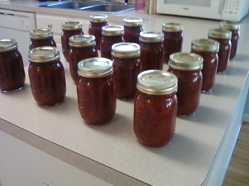 After going to the Farmer’s Market on Monday morning, prepping, blanching, stewing, and canning, I’m happy to report that the chili sauce is canned, er literally.
