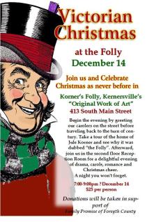 The evening is set at Christmas in the London home of G.K. Chesterton. As people arrive the Folly they will be welcomed and introduced to the Folly and invited to tour the home before the show and see all the Christmas decorations as well as enjoy the charm of the home. At about 7:30 people will be invited to the second floor Reception Room where we will join the Chestertons and their friends for a Christmas party. The evening is interactive, and the audience is invited to join the Chestertons in singing carols and playing games. Throughout the evening the Chestertons share their talents by reciting poetry and telling stories. Additionally, a story is unfolding among the characters themselves as they celebrate Christmas. The evening is very engaging is appropriate for primary ages and up. During the evening, we will invite people to make donations to Family Promise of Forsyth County as well as acknowledge opportunities to support the preservation of the Folly.
