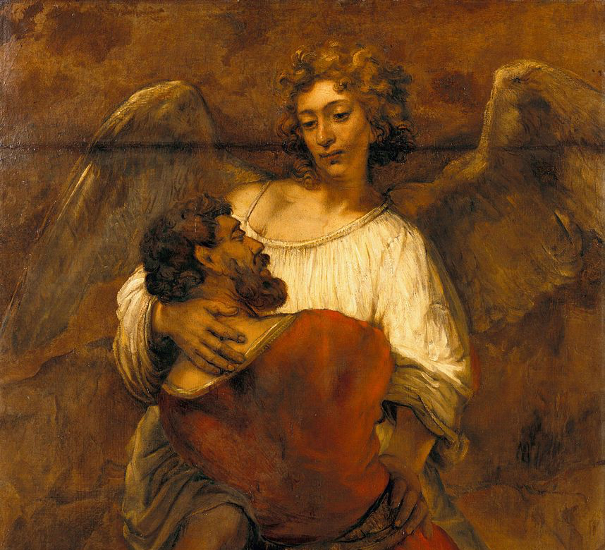 The artwork is Rembrandt’s painting of the same event which I find intriguing. The angel is not struggling, but is merely laying Jacob down. The angel’s left hand rests on Jacob’s hip which he will dislocate and his right hand holds Jacob’s neck as if to lay him down gently. I wonder what you see?