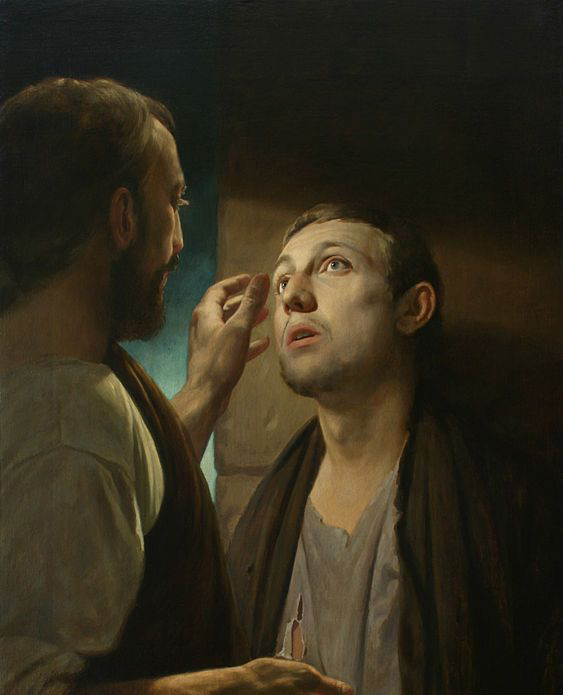 Artwork: Christ and the pauper. Healing of the blind man. 2009. Canvas, oil. 100 x 55. Artist A.N. Mironov. Andrey Mironov [CC BY-SA 4.0 (https://creativecommons.org/licenses/by-sa/4.0)%5D