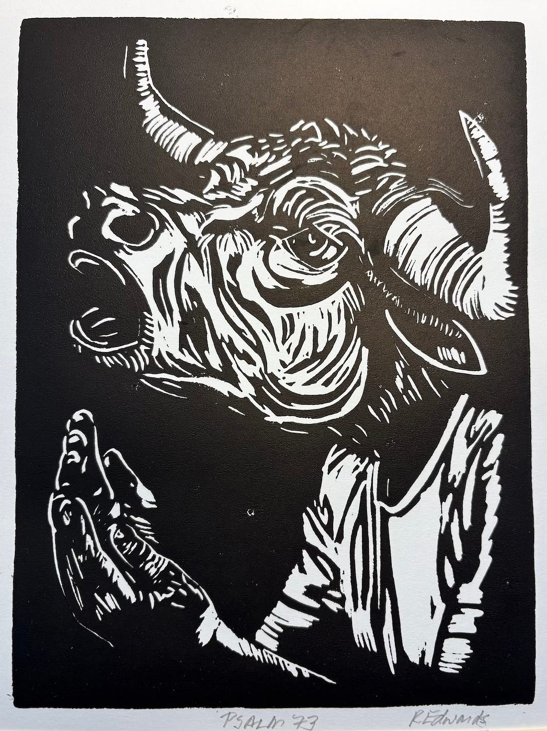 For my part, I am grateful and excited to be able to participate. I provided a linocut inspired by Psalm 73:21-22 which reads,